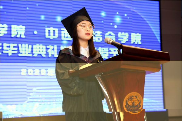 “深深母校情,悠悠學子心”。校優秀畢業生、最具影響力畢業生2015級中西醫臨床醫學專業黃曉燕同學發言,她代表全體畢業生向母校和恩師表達真摯感謝。她圍繞“創新”主題,結合中醫藥在此次疫情的中的表現,講述了自己對中醫藥傳承與發展的思考。她也代表全體中醫學子向母校鄭重承諾:以傳承中醫藥為己任,為中醫藥走向世界做出不懈努力!
