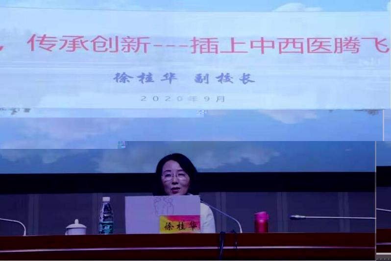 徐桂華教授圍繞曆史與傳承、創新與發展,向新同學們介紹了南中醫創校以來,在各個曆史時期不斷發展前行的光輝曆程,介紹了中醫藥在抗擊新冠疫情方面的突出成效以及南中醫人在抗疫戰争中的傑出貢獻。同時也介紹了我們學校強大的師資力量與深厚的曆史底蘊。她還通過幾位傑出校友的成長經曆向同學們闡明了南中醫在國家發展戰略中的重要擔當,引導同學們培育愛校情懷,堅定中醫信心,肩負青年使命。
