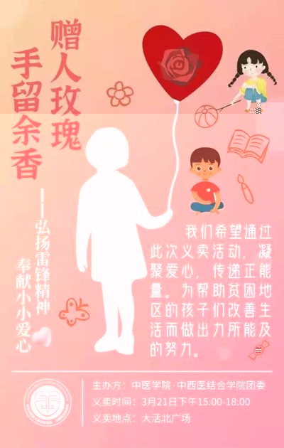 三月是學雷鋒活動月,為弘揚雷鋒精神,踐行社會主義核心價值觀,伟德网站是多少•中西醫結合學院團委于3月21日下午在大學生活動中心北廣場舉行了“贈人玫瑰,手留餘香”愛心義賣活動。