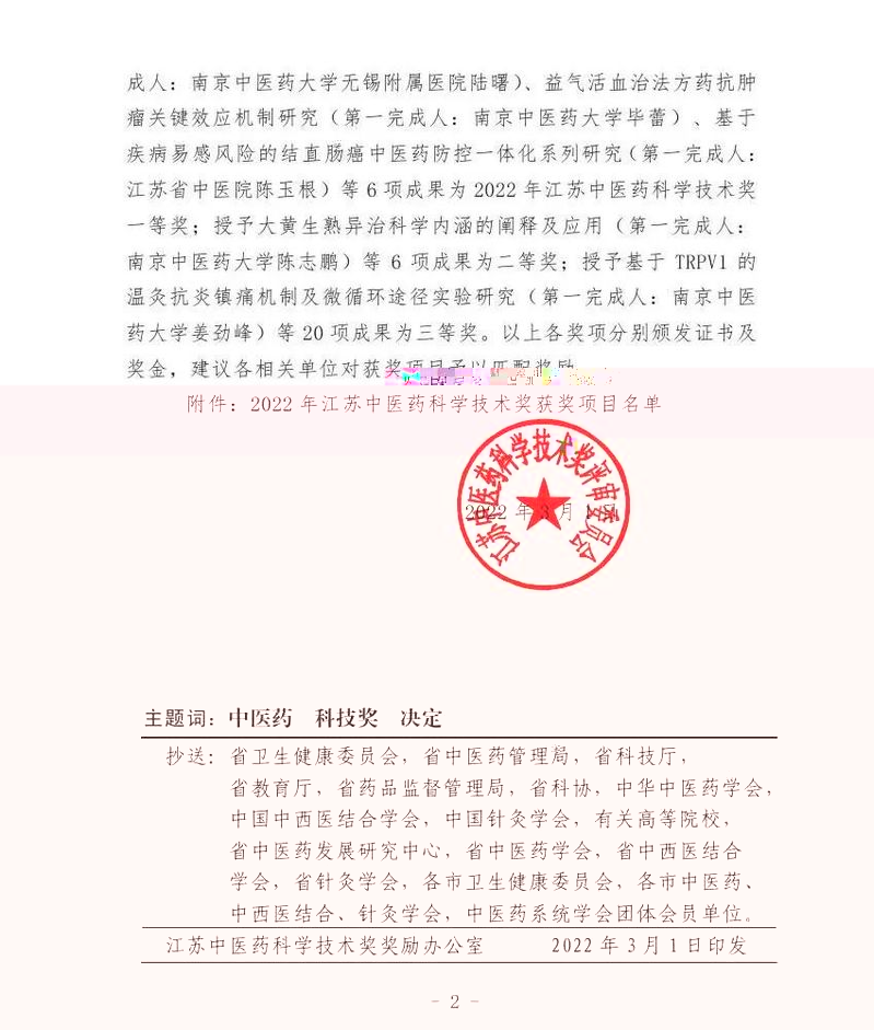 3月1日,2022年江蘇中醫藥科學技術獎獲獎項目正式公布,我院吳承玉教授申報的《中醫藏象辨證體系的理論構建與臨床應用研究》、畢蕾教授申報的《益氣活血治法方藥抗腫瘤關鍵效應機制研究》,兩個項目均榮獲江蘇中醫藥科學技術獎一等獎。
