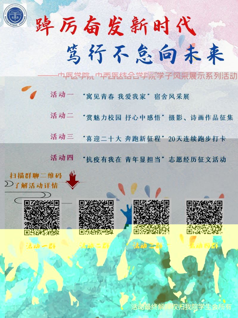 為豐富同學們現階段疫情防控常态化下的校園文化生活,引導同學們以樂觀積極的生活态度應對疫情,記錄“共克時艱”的校園生活,學院學生會舉辦“踔厲奮發新時代 笃行不怠向未來”學子風采展示系列活動,小夥伴們快來參加吧!