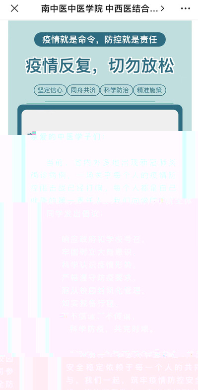 學院黨政領導班子在黨員微信群、教師微信群、本科生及研究生微信群中深入動員和部署,及時地向全體學生傳達上級的各項規定和要求,做到信息傳遞地上通下達;充分利用學院官網、微信公衆号等途徑,及時宣傳健康防護知識和防控要求。學院各黨支部、教研室以線上會議形式學習貫徹疫情防控相關政策,号召全體師生全力配合和支持所在社區的疫情防控工作。此外,針對學生在校園封閉管理時期可能出現的焦慮和不安情緒,學院有序開展了學生心理健康教育與服務工作,引導學生正确認識疫情的反複,不斷加強人文關懷,正面引導學生積極面對防疫壓力。