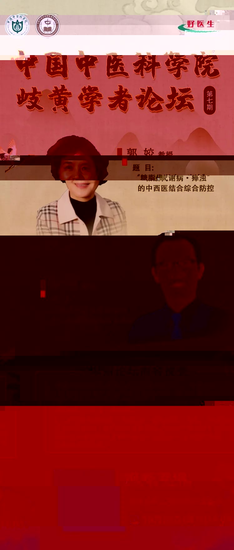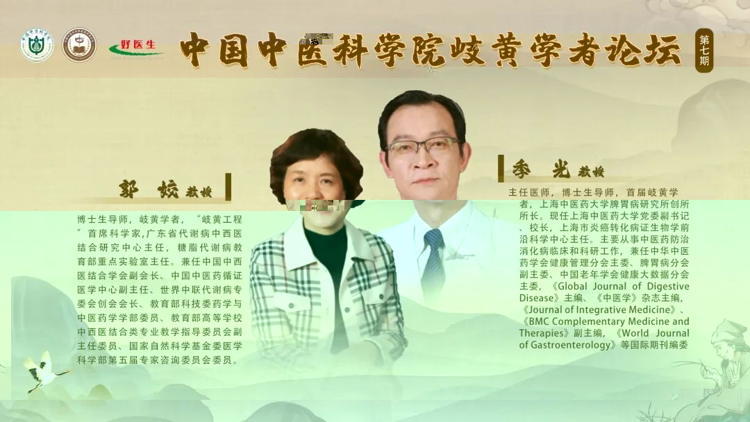 為更好地開展學術交流活動,搭建高層次學術交流平台,促進中醫藥學術發展,2022年中國中醫科學院将舉辦系列中國中醫科學院岐黃學者論壇學術活動。10月22日(周六)下午2點,特邀國家中醫藥管理局岐黃學者、廣東省代謝病中西醫結合研究中心郭姣教授,上海中醫藥大學季光教授做報告。