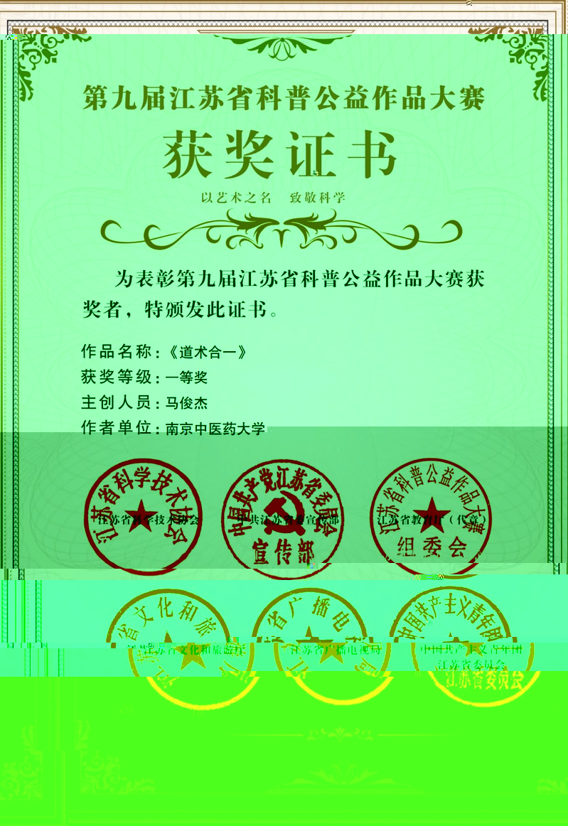 江蘇省教育廳、江蘇省文化和旅遊廳、江蘇省廣播電視局、中國共産主義青年團江蘇省委員會聯合舉辦的第九屆江蘇省科普公益作品大賽評選結果正式公布(蘇科協發〔2023〕137号),我院馬俊傑副教授申報的紀錄片《道術合一》獲科普影視類(成人組)一等獎。