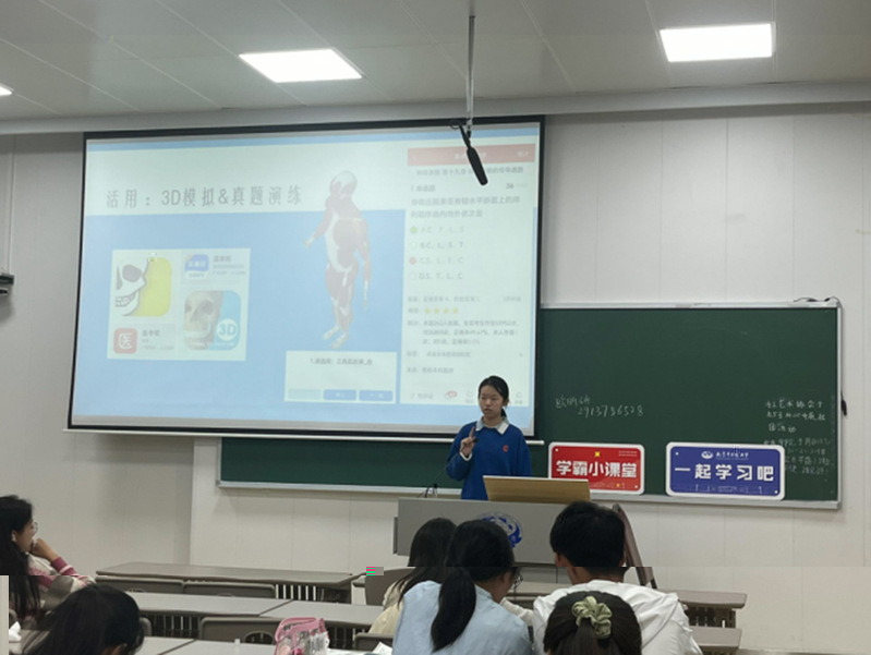 周覓同學提出了學習過程中常遇到的誤區——死記硬背,并進行自己的學習方法分享。《正常人體解剖學》作為背誦量較大的一門課,在背誦過程中,很多同學會陷入死記硬背的誤區。周覓同學以大家熟悉的高中數學題為例,告訴同學們學習人解時要不斷回顧以往知識,形成知識網絡。與此同時,周覓同學也向大家推薦了一些實用的學習平台。